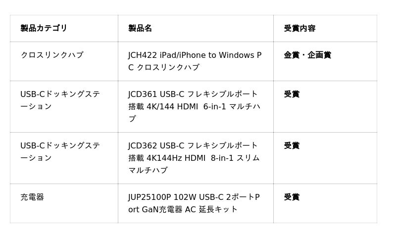 中でも、「JCH422 iPad/iPhone to Windows PC クロスリンクハブ」は、「金賞」および「企画賞」を同時受賞するという快挙を達成いたしました。このほか、「JCD361」および「JCD362 USB-Cマルチハブ」、ならびに「JUP25100P GaN急速充電器」も、各カテゴリーにおいてその高い技術力と優れたデザイン性が高く評価されました。