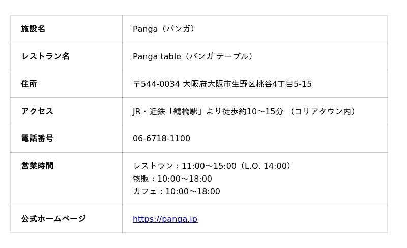 レビューでも「木のぬくもりがある」「吹き抜けの開放感に癒される」と評される空間は、食事の体験をより豊かなものにします。施設は、レストラン「Panga table」に加え、Pangaブランドの調味料やパンチャン(おかず)を購入できる物販エリア(「Panga basic」「Banchan lab.」など4ライン)を併設しています。