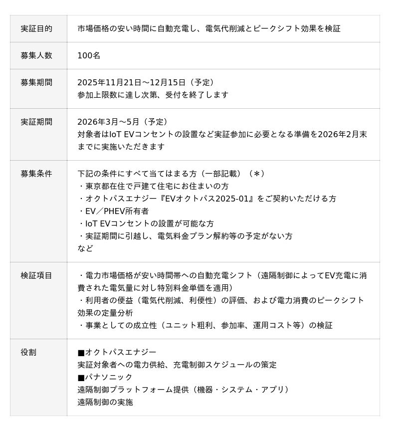本実証では、こうした社会的背景を踏まえ、電力市場価格に応じたEV充電の最適化を通じて、家庭部門におけるピークシフトの可能性とユーザー利便性の両立を検証します。具体的には、オクトパスエナジーの電力プラン「EVオクトパス」と、パナソニックの「おうちEV充電サービス」アプリ(※1)およびIoT EVコンセント(※2)を連携させ、遠隔で充電を最適制御します。実証期間は2026年3月から5月の3か月間を予定しており、東京都内の戸建てにお住まいでEV/PHEVおよびEV充電設備をお持ちのお客さまを対象に、モニターを募集します。