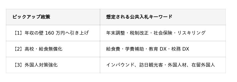 【いい入札の日 2025:公共入札トレンド予測発表】高市政権発足で公共入札はどう動く?「年収の壁 160 万円」「高校・給食無償化」「外国人対策強化」に注目