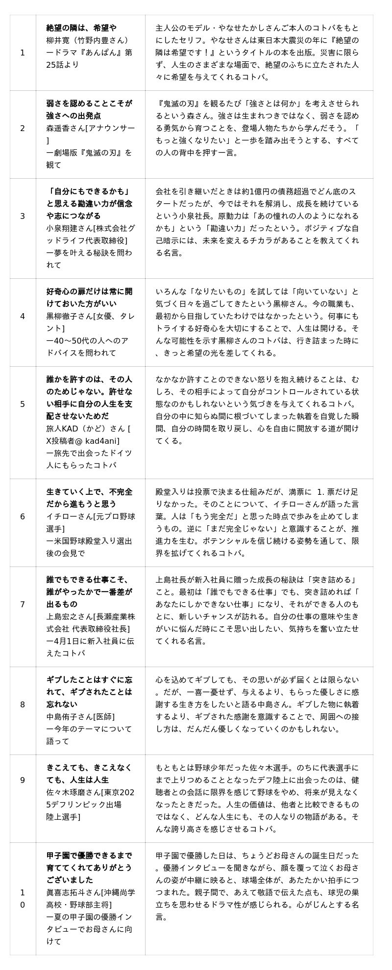 『あんぱん』の名言「絶望の隣は、希望や」ほか、イチロー選手、黒柳徹子さんら名言がノミネート!2025年「感動した!」コトバは?第9回「名言グランプリ」開催!