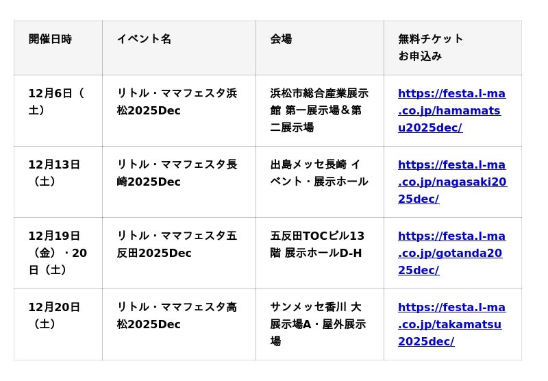 【12月の無料親子フェスタ】浜松・長崎・五反田・高松にて開催!ママパパに選ばれる話題のイベント【リトル・ママフェスタ】へ♪