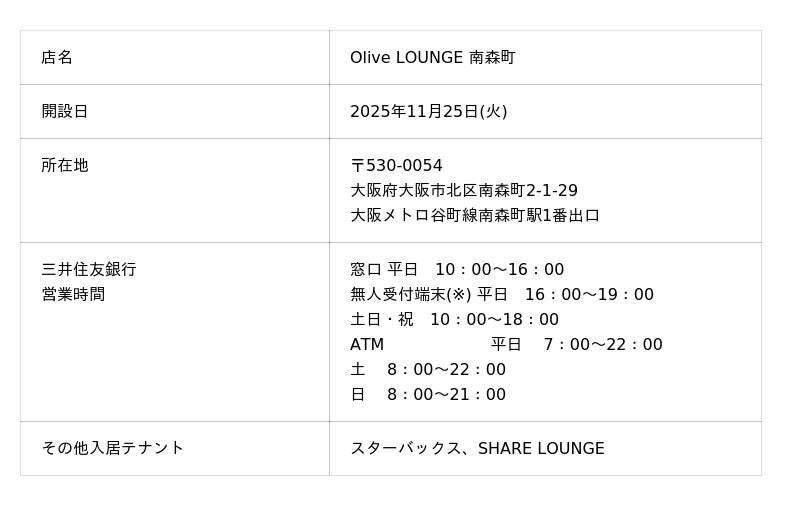 株式会社三井住友銀行(頭取 CEO:福留 朗裕、以下「三井住友銀行」)は、2025年11月25日に、三井住友銀行と三井住友カードの共同商品「Olive(オリーブ)」をモチーフとした新しいコンセプトの個人のお客さま向け店舗「Olive LOUNGE(オリーブ ラウンジ)南森町」を開設することを、お知らせいたします。銀行とスターバックス、SHARE LOUNGEが一体になった店舗として、多様な人が心地よく過ごせる場を目指します。
