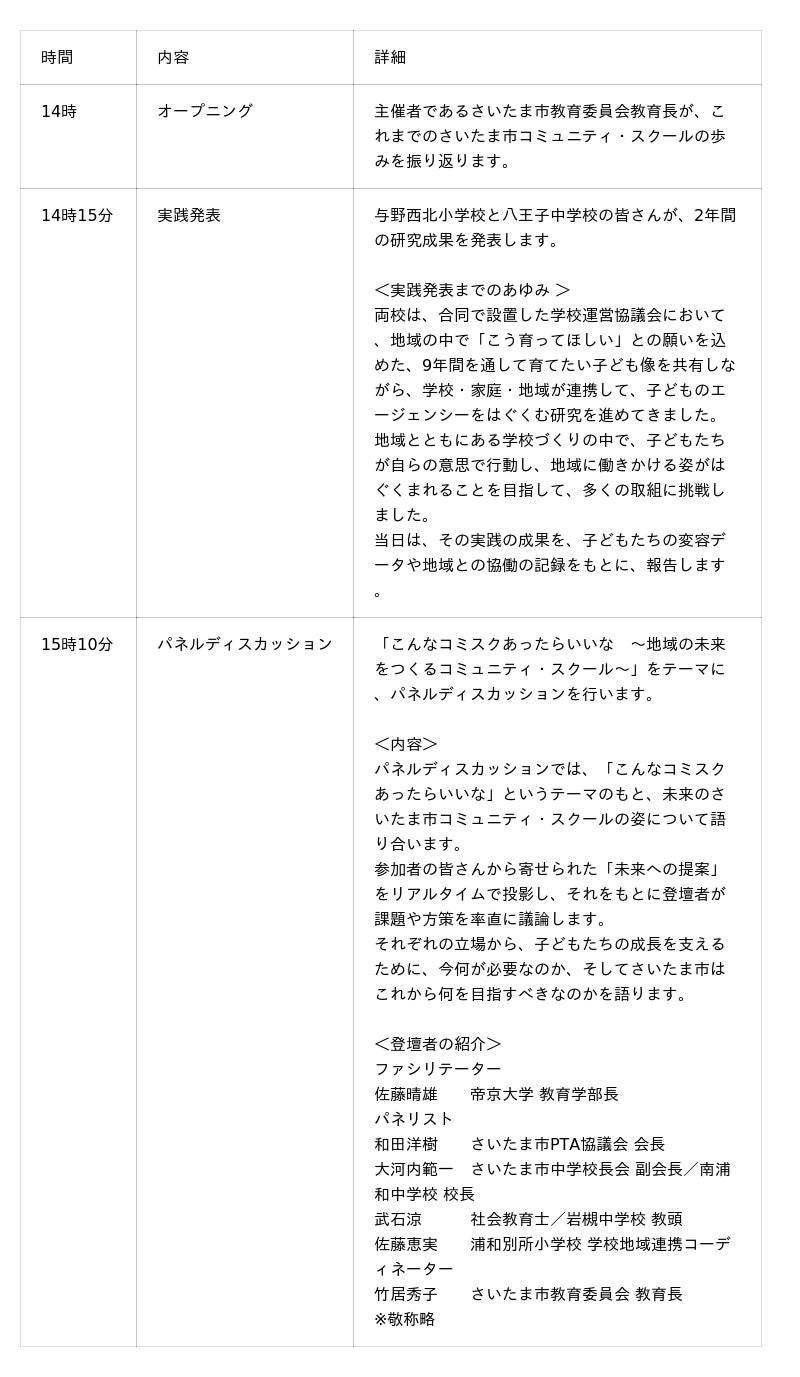さいたま市教育委員会では、「こんなコミスクあったらいいな 〜地域の未来をつくるコミュニティ・スクール〜」をテーマに、学校・家庭・地域が協働して未来をつくるさいたま市コミュニティ・スクールのあり方を、参加者の皆さんと共に考えるため「さいたま市コミュニティ・スクールシンポジウム」を開催します。