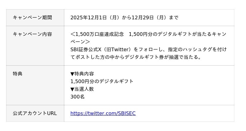 国内初となる証券総合口座1,500 万口座を突破したのは、これらの取り組みがお客さまから支持された結果であると考えています。このたびの達成を記念して、2025年12月1日(月)から12月29日(月)までの期間で、「1,500万口座達成記念 1,500円分のデジタルギフトが当たるキャンペーン」を実施予定です。本キャンペーンは新たに口座開設される方だけでなく、すでに口座をお持ちの方も広くご参加いただけます。さらに、2026年1月以降も当社をご愛顧いただいているお客さま向けのキャンペーンを予定しています。