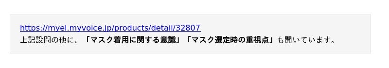 本調査は、外出時や自宅でのマスク使用についてです。病院や業務上での使用は除きます。調査結果をお知らせいたします。