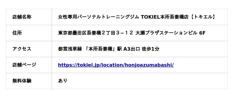 都営浅草線 本所吾妻橋駅『女性専用パーソナルトレーニングジム TOKIEL本所吾妻橋店【トキエル】』オープン【東京都墨田区吾妻橋2丁目3−12 大瀬プラザステーションビル 6F】