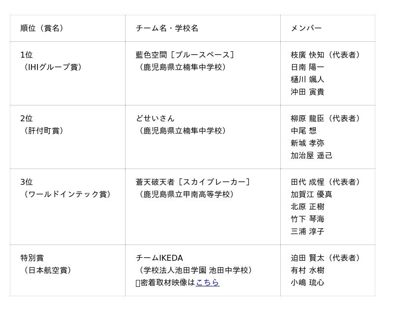 2026年2月7〜8日に開催される宇宙甲子園ロケット部門全国大会(福島県南相馬市にて開催)に、1位の『藍色空間[ブルースペース]チーム(鹿児島県立楠隼中学校)』が推薦され、2026年7月頃に、イギリス・ファンボロで開催される世界大会(米英仏国の航空宇宙工業会が主催するIRC(International Rocketry Challenge)への出場を目指します。