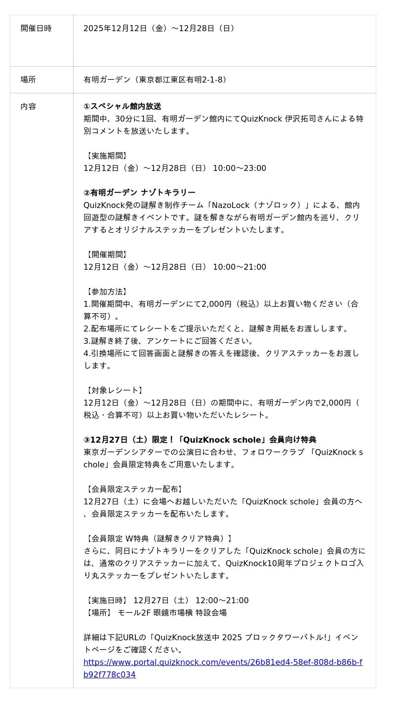 住友不動産商業マネジメント株式会社(本社:東京都新宿区、代表取締役社長:山本 直人)は、東京ガーデンシアターにて12月27日(土)に開催される「QuizKnock放送中 2025 ブロックタワーバトル!」の公演を記念し、QuizKnockとのコラボキャンペーンを実施いたします。