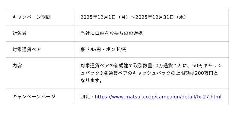メキシコペソ/円のスプレッド縮小キャンペーンでは、2025年12月1日(月)から2026年2月27日(金)の3か月間、業界最狭水準(※1)の0.2銭へ縮小いたします。豪ドル/円・ポンド/円を対象としたキャッシュバックキャンペーンでは、2025年12月1日(月)から2025年12月31日(水)の1か月間、新規建て取引数量10万通貨ごとに、50円のキャッシュバックを行います。