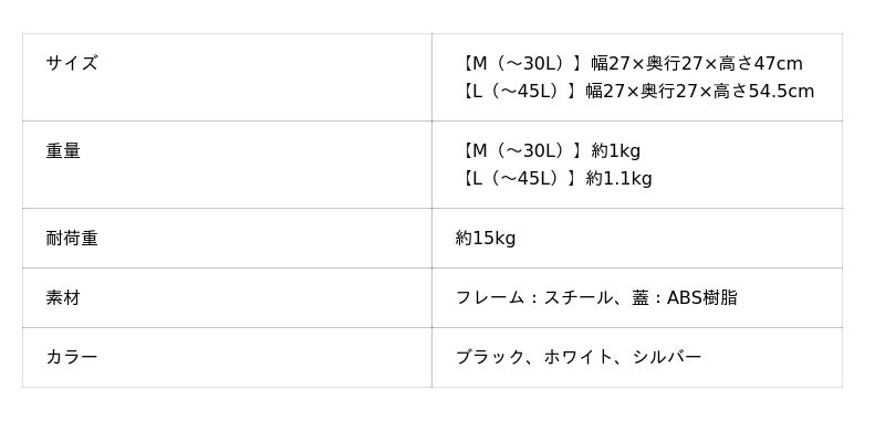 骨組みだけのフレームデザインにすることにより、すっきりとした印象をあたえます。またフレームタイプなので設置したゴミ袋の隅まで無駄なく使用することが可能です。