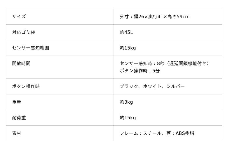 センサータイプの蓋だと、付近を通過しただけでセンサーが反応しにおいが漏れてしまうということもありますが、本製品はセンサー範囲が12〜20cmと付近を通っただけではセンサーが作動しにくい距離にしているので無駄な開閉を防ぐ仕様になっています。
