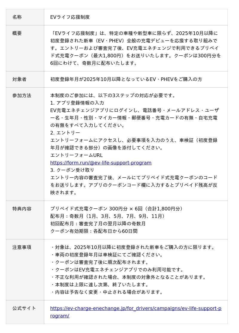 ミライズエネチェンジ株式会社(本社:東京都中央区、代表取締役社長:柘野 善隆)は、2025年10月以降に初度登録された新車(EVおよびPHEV)を購入された方を対象に、EV充電エネチェンジでご利用いただける最大1,800円分のプリペイド式充電クーポンをプレゼントする「EVライフ応援制度」を開始いたします。