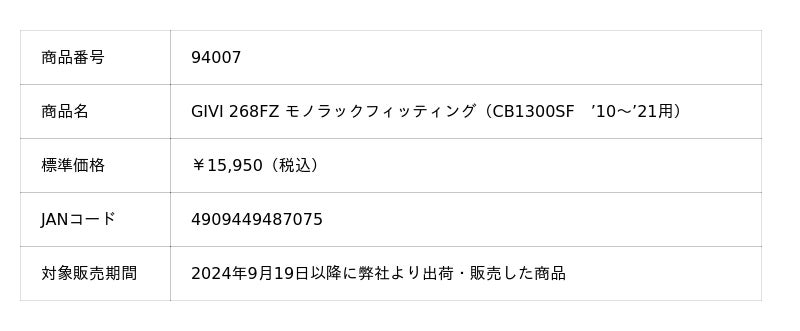 このたび、株式会社デイトナ(〒437-0226 静岡県周智郡森町一宮4805)が販売しております「GIVI社製モノラックフィッティング 268FZ〈CB1300SF ’10〜’21用〉」におきまして、2024年9月19日以降の出荷分に、製造工程上の不備により溶接処理が不足していることが判明いたしました。