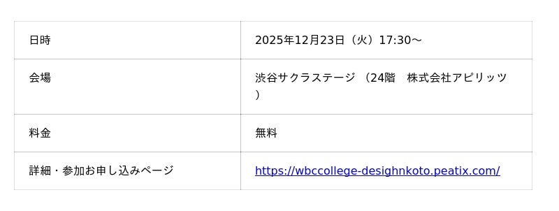 株式会社アピリッツは、2025年12月23日(火)にオープンスペースを公開し、Design KOTO株式会社が企画する「クリエーターお悩み相談室 & ポートフォリオワークショップ」を開催いたします。