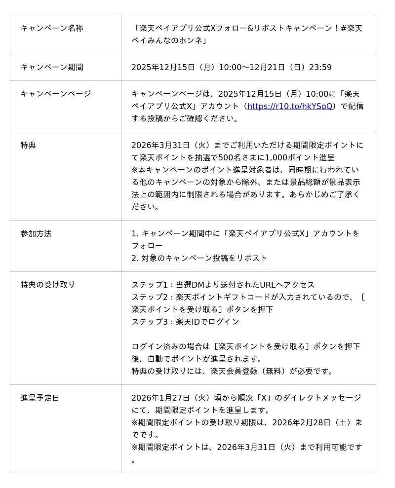 このたび、本ページの公開を記念して、「楽天ペイアプリ公式X」(@RakutenPay_App)では2025年12月15日(月)から12月21日(日)まで、「楽天ペイアプリ公式Xフォロー&リポストキャンペーン!#楽天ペイみんなのホンネ」を実施します。キャンペーン期間中に「楽天ペイアプリ公式X」をフォローし、対象の投稿をリポストした方の中から抽選で500名に「楽天ポイント」を1,000ポイント進呈します。