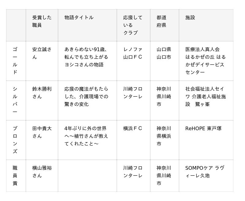 安立さんは「『ヨシコさんともっと楽しみたい』というスタッフの思いから始まった活動が、レノファ山口の松田選手との絆を結び、91歳の彼女に驚くべき活力を与えてくれました。 目標に向かって困難を乗り越えるヨシコさんの姿は、私たち支援者にとっても大きな希望であり、原動力となっています。 今後もこの受賞を励みに、関わるすべての皆様と共に『人生の喜び』を見つけ、いくつになっても輝けるよう挑戦を続けてまいります。」と受賞への思いを語りました。