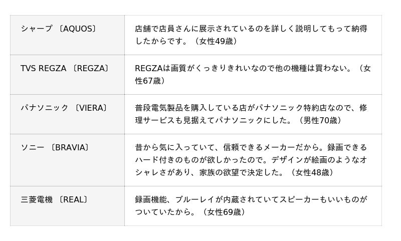 主に利用している薄型テレビのメーカー別にみると、『ソニー』では「メーカー・ブランド」「画質のよさ」、『パナソニック』では「メーカー・ブランド」の比率が高くなっています。
