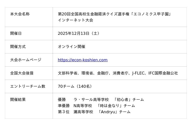 住信SBIネット銀行株式会社(本社:東京都港区、代表取締役社長(CEO):円山 法昭、以下「住信SBIネット銀行」)は、金融経済教育の一環として、2025年12月13日(土)に開催された第20回全国高校生金融経済クイズ選手権「エコノミクス甲子園」インターネット大会(以下、本大会)を主催いたしましたことをお知らせいたします。