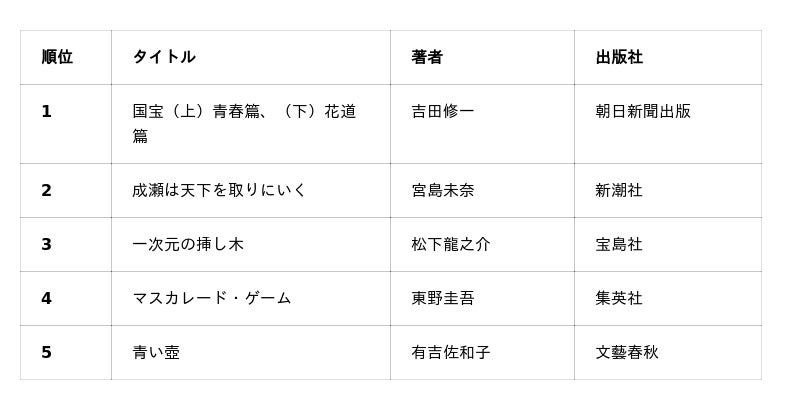 第1位は日本文学の伝統に脈々と流れる芸道小説の金字塔『国宝』です。吉沢 亮主演で映画化され、22年ぶりに邦画実写の歴代興行収入ランキング第1位を達成したことも話題となりました。第2位には、2024年の本屋大賞受賞作であり、新潮社主催新人賞で史上初の三冠にも輝いた宮島未奈のデビュー作『成瀬は天下を取りにいく』がランクイン。今年を彩った話題作が上位を占める結果となりました。