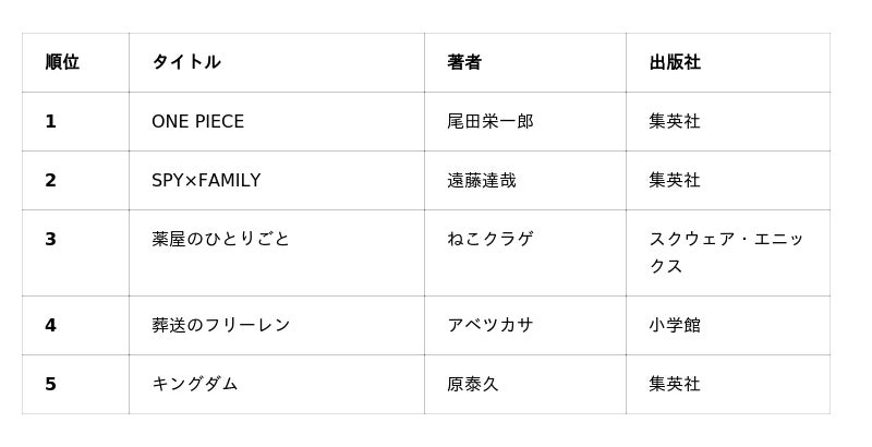 上位には、昨年に引き続き『ONE PIECE』『SPY×FAMILY』の人気作がランクイン。また、今年連続2クールでアニメ化され、2026年にはアニメ3期と劇場版の公開も決定している『薬屋のひとりごと』が第3位となりました。さらに、第4位の『葬送のフリーレン』は1月からアニメ2期が放送、第5位の『キングダム』は2026年夏に劇場版第5弾の公開を控えています。今年の顔となる話題作や今後も要チェックな人気作が並びました。