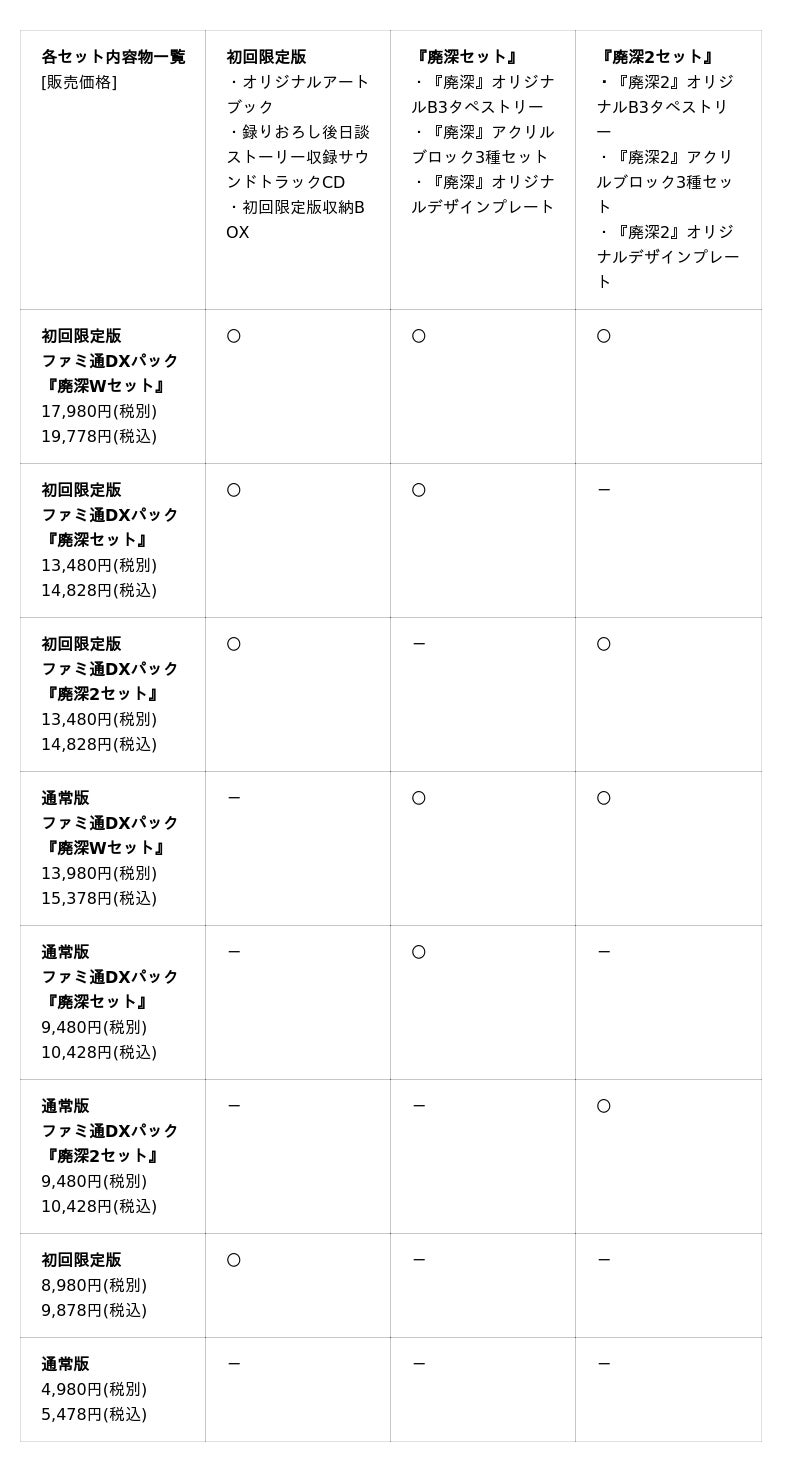 ゲームソフトに『廃深』『廃深2』それぞれの限定アイテムが付属するセットです。メインビジュアルが大きく描かれたB3タペストリーや、物陰で息をひそめるヒロインたちがデザインされたアクリルブロックなどシリーズのビジュアルが多数盛り込まれた豪華グッズセットをお見逃しなく! 各ナンバリングのグッズが手に入る『廃深セット』『廃深2セット』の他、両タイトルのグッズが一挙に手に入る『ファミ通DXパック廃深Wセット』もご用意しております。◆ファミ通DXパック『廃深セット』同梱物