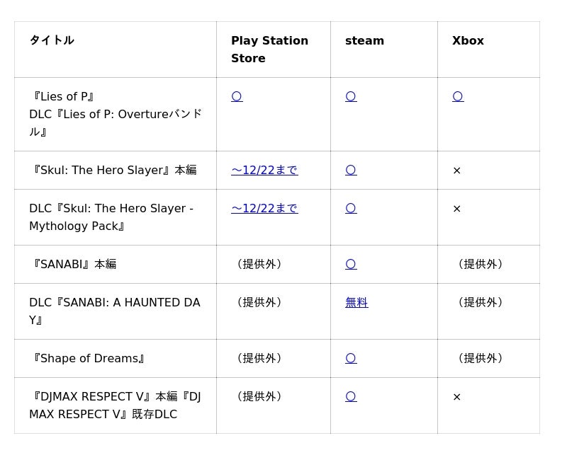 今年DLCをリリースしたコンソール・PC向けアクションRPG『Lies of P』やPC向け『SANABI』、今年リリースされた『Shape of Dreams』などのNEOWIZタイトルが、セールス対象になります。また、PC(Steam)、PlayStation、Xbox向けの実施になります。
