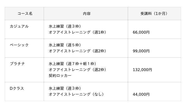 また、既存のフィギュア教室は多くの国際大会出場選手育成経験のある重松直樹氏をはじめ、プリンスアイスワールドで活躍中の小沼祐太氏ほか計6名の新指導者を招聘し、スケートに触れるきっかけづくりとしてお子さま向けの教室に新規コースを開設します。