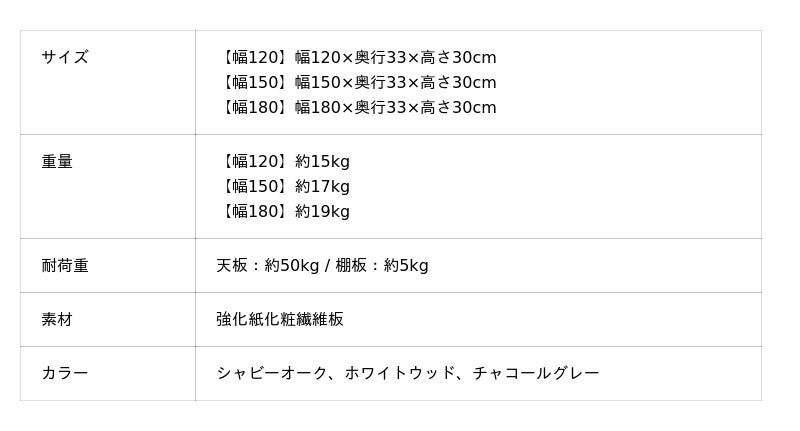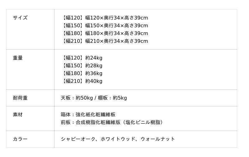 120cm、150cm、180cm、210cmのセット販売と単品で1台ずつ購入することができるのでお部屋のサイズやライフスタイルに合わせて横につなげて壁に沿って一列に設置することや、テレビ台として複数台つなげ、残りはキャビネットとして使用することもできます。横につなげる際にはそれぞれ2か所のねじ穴から挟み込むように連結ボルトを締めるだけでずれることなく簡単に連結することが可能です。