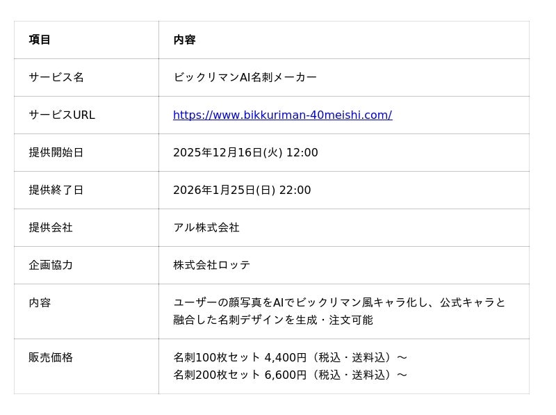 アル株式会社(本社:東京都渋谷区、代表取締役:古川健介)は、株式会社ロッテ(東京都新宿区、代表取締役社長執行役員:中島英樹)と企画協力のもと提供中の生成AIサービス「ビックリマンAI名刺メーカー」について、2025年12月16日の提供開始から1週間が経過し、連日、販売開始後数分で完売するなど、想定を大きく上回る反響をいただいていることをお知らせいたします。