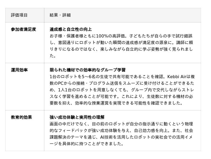 プログラミングスクールとして、生徒一人に一台のロボット導入はコスト面から躊躇しておりました。しかし今回の体験会を通じて、Kebbi Airであれば1台で5〜6名の生徒にレッスンが可能であると分かりました。他のロボット教材ではここまでスムーズに複数台PCからデータ送信ができるものはなく、小中高の情報授業など、教育現場での活用が十分に期待できると実感しました。今後の教育業界でKebbi AirがAIロボット教材として活躍する姿が目に浮かびます。