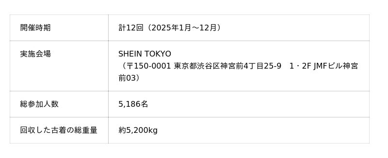 「SHEIN」は、支援を必要とする方々をサポートしたいという思いから、古着交換・寄付キャンペーン『#SHEIN Again』を2024年7月より実施してきました。2025年12月時点で計17回開催し、うち2025年は年間で12回の開催となりました。2025年の総参加者数は5,186名に達し、回収した古着の年間総重量は約5,000kgを超えました。ご参加いただいた皆さまに心より感謝申し上げます。