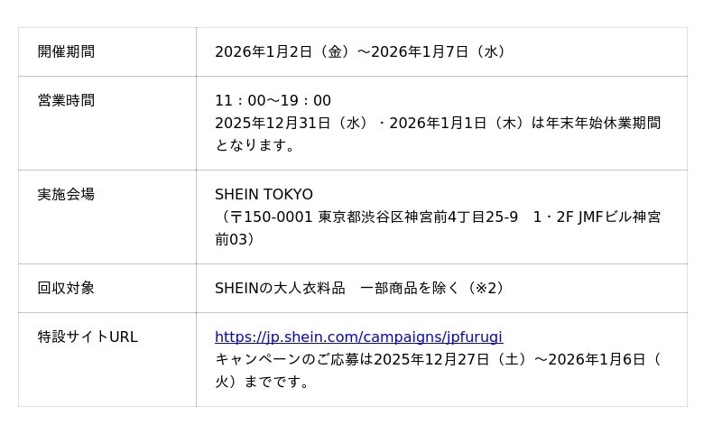 また好評につき、2026年も本キャンペーンの継続が決定し、第18弾を2026年1月2日(金)から2026年1月7日(水)に東京・原宿にあるショールーム「SHEIN TOKYO」にて開催いたします。参加にあたっては、応募ページから事前にお申し込みいただき、あわせてSHEIN公式LINEアカウントを友だち追加してください。そのうえで、「SHEIN TOKYO」に古着をご持参いただくことでキャンペーンにご参加いただけます。さらに、SNSへ投稿いただいた方には、追加でもう1点プレゼントがもらえるキャンペーンも実施いたします。年末の大掃除などで不要になったSHEINの洋服をぜひお持ちいただき、支援を必要とする方々をサポートする取り組みにご協力いただけますと幸いです。