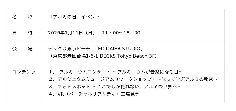 この度、制定から初めて当日を迎える、1月11日に、アルミニウムの魅力・価値をより身近に感じてもらう体験イベント「アルミの日」制定記念イベントを東京・お台場の「LED DAIBA STUDIO」(デックス東京ビーチ 3F)にて開催いたします。