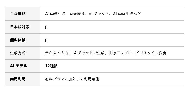 - マルチモデル対応で幅広いスタイル表現:最先端の生成AI画像モデルをプラットフォームに統合しており、以下のような人気モデルが利用可能です: