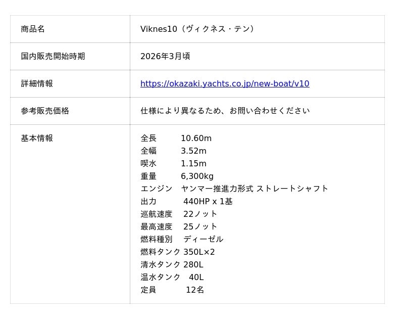 「株式会社オカザキヨット」(本社:兵庫県西宮市)は、ノルウェーを拠点とするモーターボートメーカーの「Viknes(ヴィクネス)」(本社:ノルウェー)の日本国内初のディーラー契約を結び、日本での航海に適したモデル「Viknes10」を国内で初めて販売します。ジャパンインターナショナルボートショー2026(2026年3月19日(木) 〜 3月22日(日) 横浜ベイサイドマリーナなどにて開催)で本邦初公開されます。Viknesのボートは、その高い品質と汎用性から、ヨーロッパを中心に多くの愛好家に支持されており、今後日本国内でもスカンジナビア・クルーザーを好むオーナーからの注目を集めると予想されます。