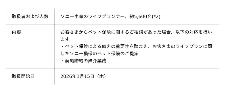 ソニー生命保険株式会社(代表取締役社長:高橋 薫、以下「ソニー生命」)は、2026年1月15日よりライフプランナー(営業社員)によるソニー損害保険株式会社(代表取締役社長:坪田 博行、以下「ソニー損保」)のペット保険の取扱いを開始します。