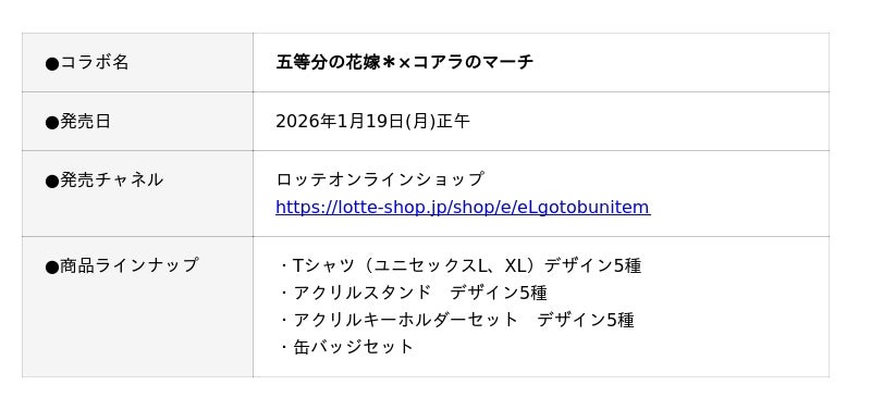 株式会社ロッテは1月19日(月)正午に、ロッテオンラインショップ限定でTVスペシャルアニメ『五等分の花嫁*』と『コアラのマーチ』のコアラたちがコラボした特別グッズを4種類販売いたします。TVスペシャルアニメ『五等分の花嫁*』のキャラクターが、コアラの耳をつけて大変身。さらに、各キャラクターをモチーフにしたコアラたちも登場します。ロッテオンラインショップにて、期間限定・受注生産となります。ぜひ詳細をご覧ください!