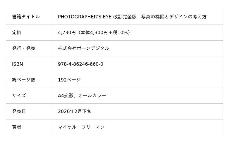 株式会社ボーンデジタル(本社:東京都千代田区、CEO:新 和也、URL:https://www.borndigital.co.jp)は、『PHOTOGRAPHER'S EYE 改訂完全版 写真の構図とデザインの考え方』(著:マイケル・フリーマン)を2026年2月下旬に発売いたします。