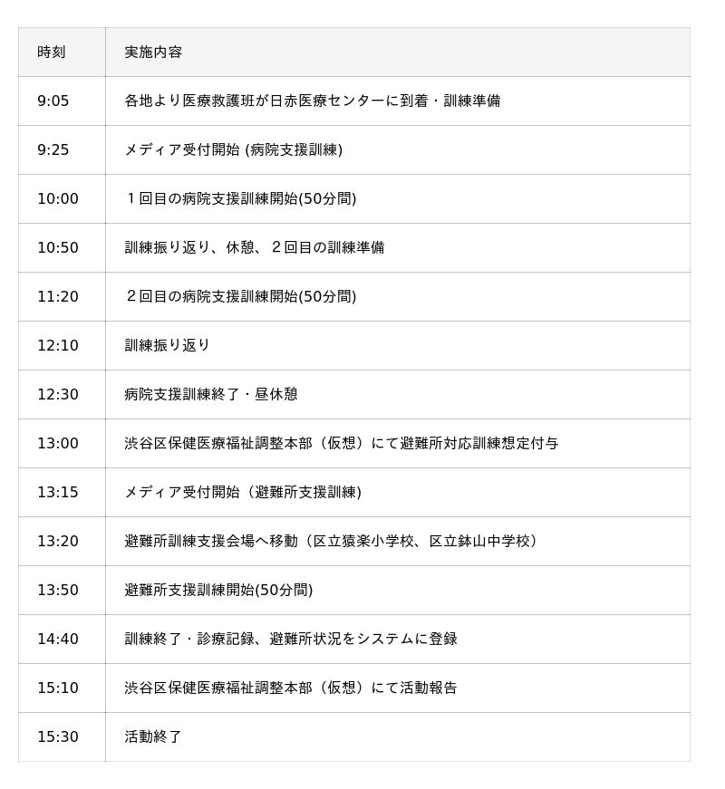 東京都支部の災害対策本部における図上訓練(意思決定や各連携先との情報伝達)日赤災害医療コーディネートチームの図上訓練(行政や他機関との連携・調整・活動指示)並びに日赤医療救護班による実動訓練(病院支援、避難所支援)という包括的な形で実践により近い状態で訓練を実施します。
