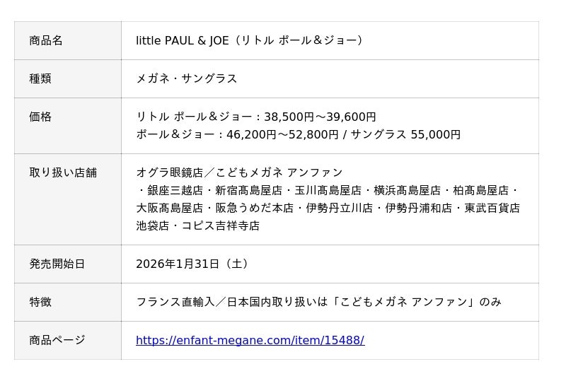 「オグラ眼鏡店」「こどもメガネ アンファン」を展開している株式会社オグラ(本社:東京都千代田区、代表取締役社長:小倉 信典)は、フランス発の人気ファッションブランド「PAUL & JOE(ポール&ジョー)」のキッズライン「little PAUL & JOE(リトル ポール&ジョー)」のアイウェアを、2026年1月31日(土)より、こどもメガネ アンファン全店にて販売開始いたします。
