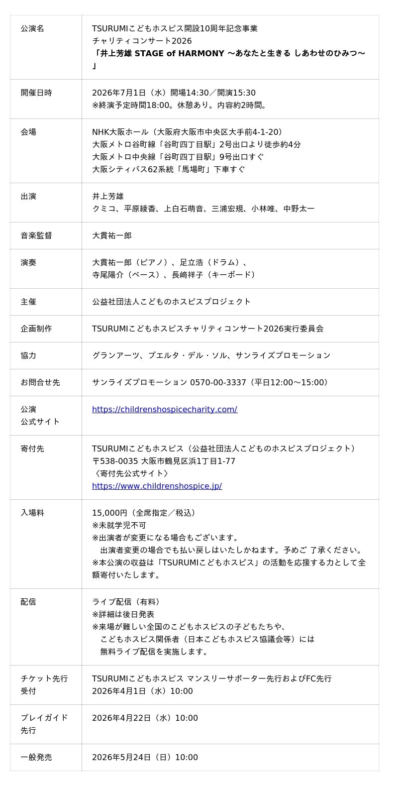 2026年7月1日(水)、公益社団法人こどものホスピスプロジェクトは、同法人が運営する「TSURUMIこ どもホスピス」開設10周年を記念し、NHK大阪ホールにて、チャリティコンサート 「井上芳雄 STAGE of HARMONY 〜あなたと生きる しあわせのひみつ〜」 を開催いたします。