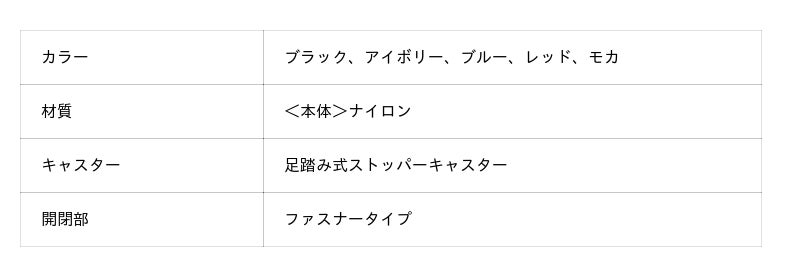 サイズは機内持ち込みが可能なSサイズ(約37L)と、7泊以上の旅行にも使用できるLサイズ(約90L)の2種類。カラーはブラック、アイボリー、ブルー、レッド、モカの5色展開です。外装は落ち着いたトーンでまとめながら、内装にはそれぞれ異なるアクセントカラーを採用。開いた瞬間に印象が切り替わるコントラストが、移動時間にさりげない楽しさを添えます。価格はSサイズが16,280円、Lサイズが21,780円(いずれも税込)です。