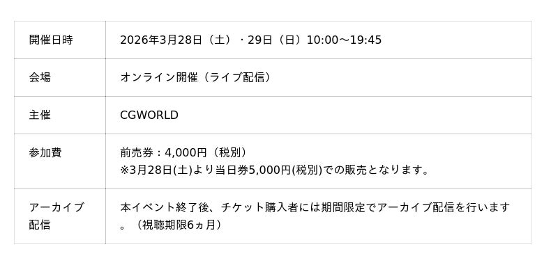 株式会社ボーンデジタル(本社:東京都千代田区、CEO:新 和也、URL:https://www.borndigital.co.jp)は、CGWORLDが主催するBlenderユーザー向けイベント「Blender Fes 2026 SS」を2026年3月28日(土)・29日(日)の2日間にわたりオンラインで開催いたします。