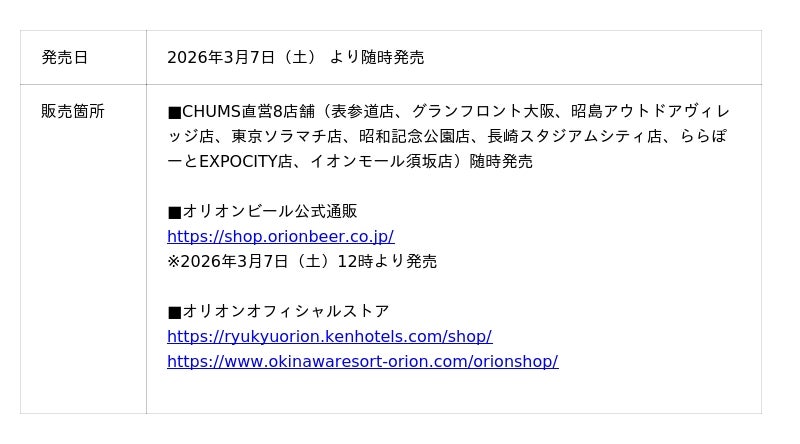 株式会社ランドウェル(東京都港区北青山、代表取締役:土屋芳隆)は、日本総代理店を務めるアウトドア・カジュアルブランド「CHUMS(チャムス)」からオリオンビール株式会社とコラボレーションしたオリジナルグッズを 2026年3月7日(土) より順次発売します。