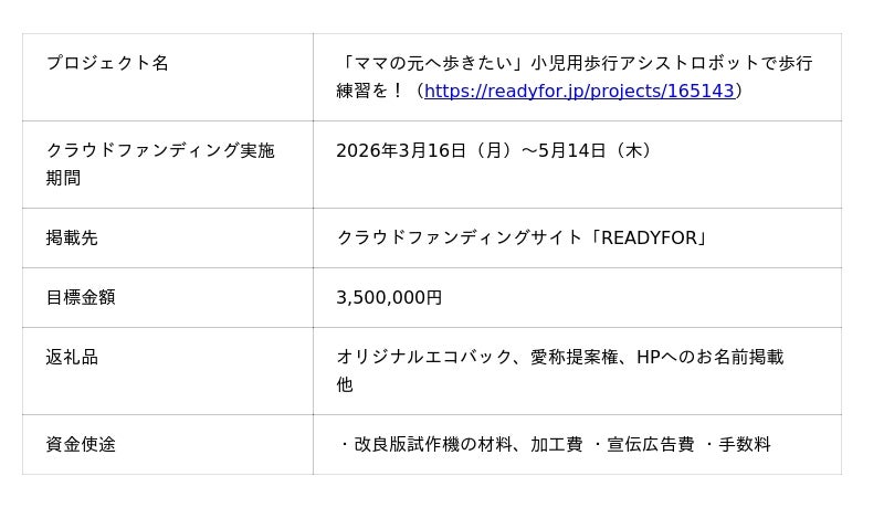 【「小児用歩行アシストロボットの開発」クラウドファンディング概要】