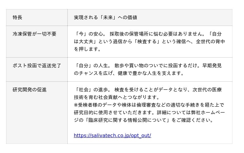 株式会社サリバテック(代表取締役 :砂村眞琴、以下「サリバテック」)は、疾病の早期発見と早期介入に寄与するというミッションのもと、常温での検体保管・返送を可能にする、だ液によるがんリスク検査「サリバチェッカー(R)」の新検査キットを開発し、2026年4月より提供開始いたします。