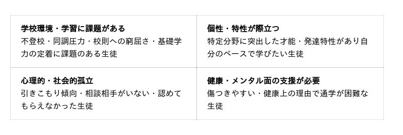 不登校・発達特性・個性的な学び方など、多様な困り感を持つすべての中学生を歓迎します。メタバース空間を活用したオンライン校舎を軸に、全国7拠点(直営4・サポート校3)でのリアル通学も選べる柔軟な環境を整えています。