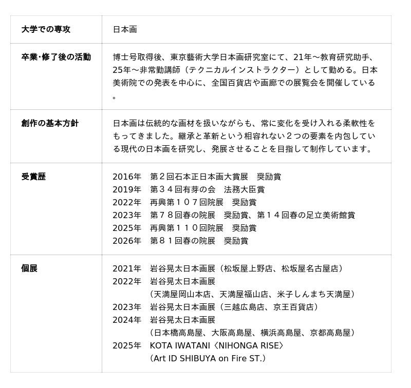 岩谷晃太(いわたに・こうた)氏 この度は、名誉ある賞をいただき、誠にありがとうございます。日本画は伝統と革新という相容れない二つの要素を内包しながら、ここまでたくさんの先人の技術や表現によって発展してきたものだと考えています。私も1人の日本画家として、今後の発展に貢献したいと思っております。