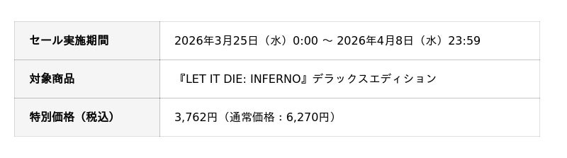 現在開催中のPlayStation(TM)Store「Spring Sale(第一弾)」に、『LET IT DIE: INFERNO』が参戦です。通常版の内容に加え、見逃せない特典の数々が同梱された「デラックスエディション」が、通常価格から40%オフの衝撃価格でラインナップ!過酷な地獄の旅をお得に始める、絶好のチャンスです。